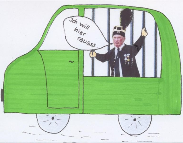 Nach den Feierlichkeiten mit der Bergparade zum 10. Deutschen Bergmannstag in Heringen/Werra war der Bergmannsverein wieder auf dem Nachhauseweg. Bei Eschwege spürte die Gruppe ein Hungergefühl, so dass der Bus an einer Schänke mit Biergarten halten musste (Parkplatz war um die Ecke). Während des Essens kam Brigitte K. ganz aufgeregt an unseren Tisch. Sie vermisste ihren "Göttergatten" Werner. Keiner hatte Werner gesehen, konnte etwas zu seinem Verbleiben sagen. Nun konnte nur noch einer helfen, der Busfahrer. Der Bitte, im Bus noch einmal nachzuschauen, kam er bereitwillig nach.